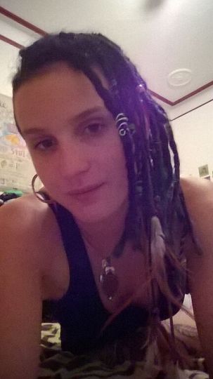 grande et élancée, dreadlocks noir et verte avec bijoux de cheveux, les 2 cotés rasé, style mélange hippie, amérindien, militari rebelle, deux nœuds style tissu tatoué derrière chaque cuisses et sur un tour de cuisse grand attrape rêve descendant jusqu'au genou, style dentelle jarretière, j'ai un piercing de langue, personnalité hyper sociable aime les gens. |